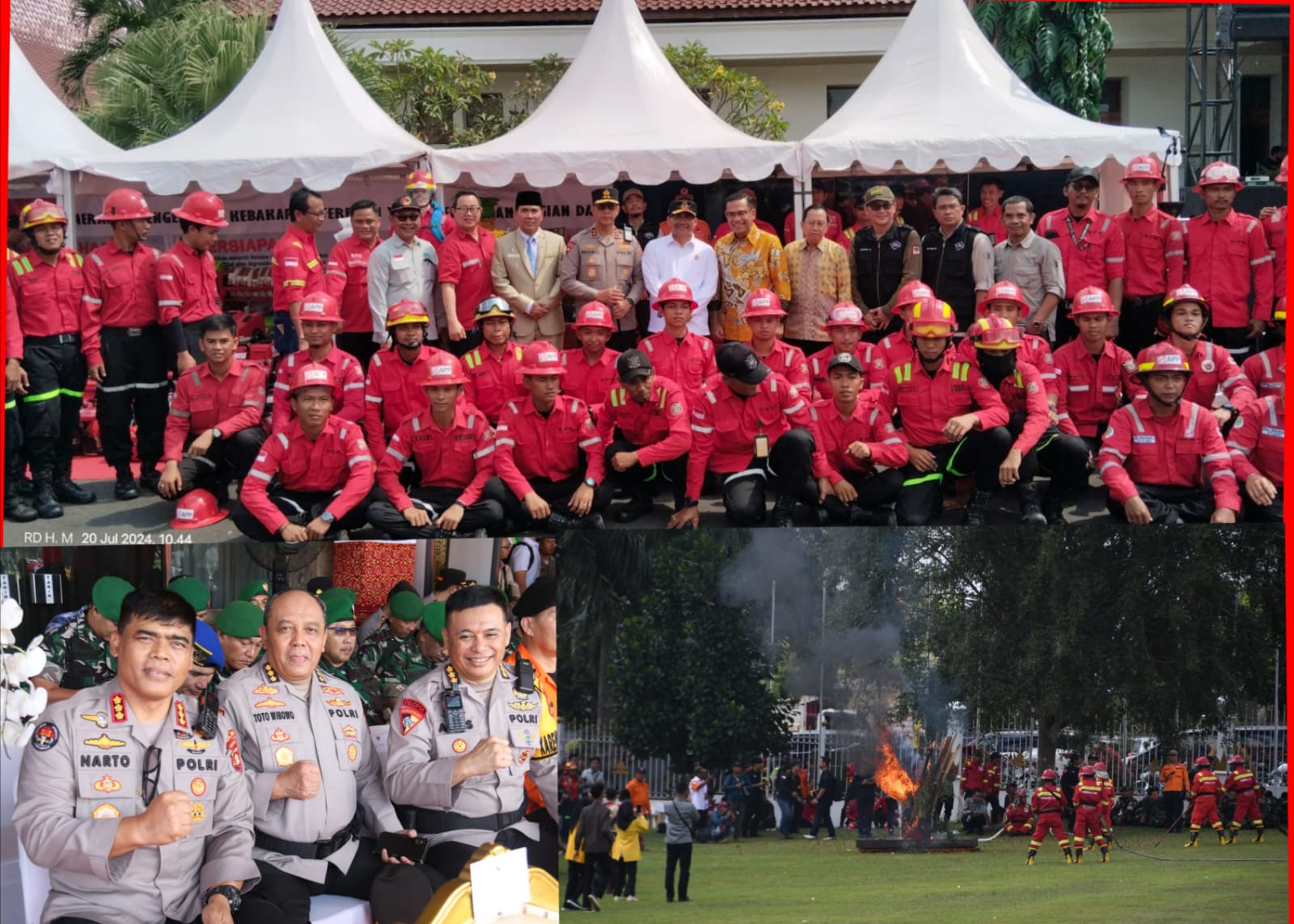 Kapolda Sumsel Irjen Pol A. Rachmad Wibowo,SIK bersama Kasatwil jajaran dan Forkompimda Provinsi Sumsel serta instansi Terkait lainnya melaksanakan Apel Siaga dan Simulasi Penanggulangan Kebakaran Hutan dan Lahan (Karhutla) Provinsi Sumatera Selatan (Sumsel) Tahun 2024 digelar di halaman Griya Agung, Palembang, hari ini. Acara ini dipimpin langsung oleh Menteri Koordinator Bidang Perekonomian, Airlangga Hartarto, selaku inspektur upacara, Sabtu (20/07/24).
