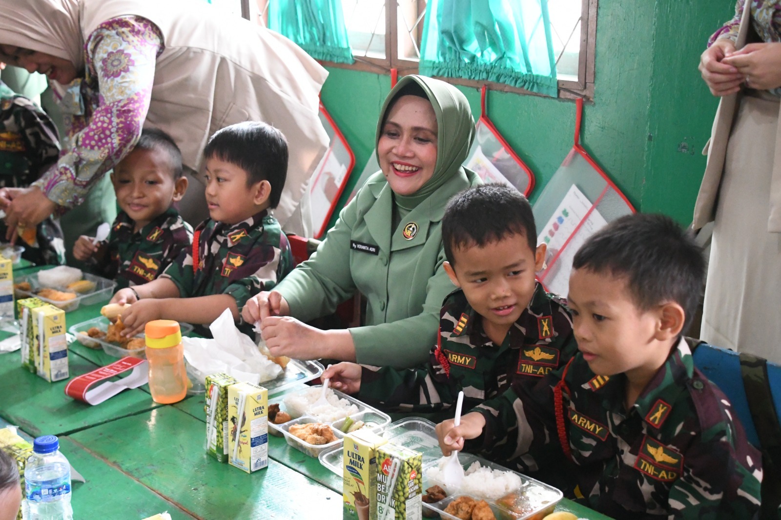 Seusai Vicon, Danrem bersama Ibu Ketua Persit KCK meninjau makan bersama anak anak TK dan SD. Danrem langsung berkomunikasi dengan siswa/siswi kelas 6.