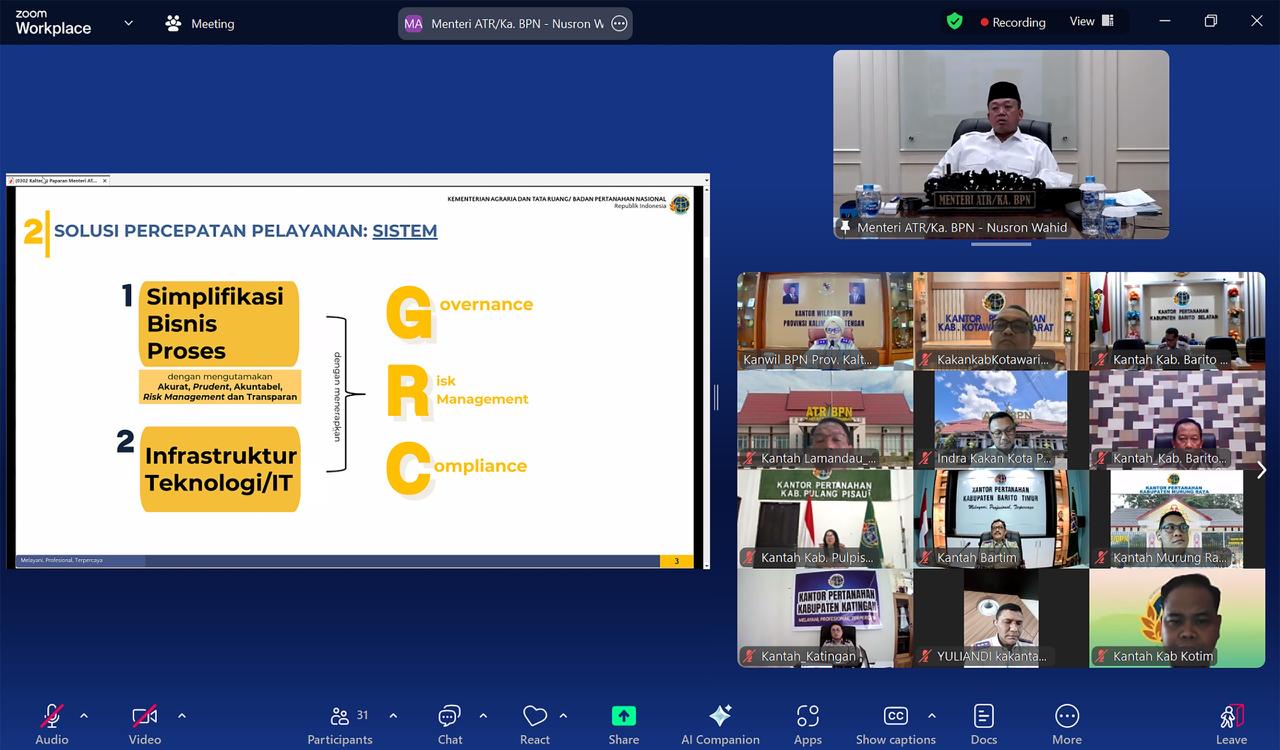 “Masyarakat sekarang itu menghendaki sebuah pelayanan yang cepat, pelayanan yang bersih. Karena itu, Bapak/Ibu, untuk mencapai pelayanan yang cepat dan pelayanan yang bersih ini mau tidak mau kita semua harus berubah,” ucap Menteri Nusron saat memberikan pengarahan secara daring kepada jajaran Kanwil BPN Provinsi Kalimantan Tengah, Senin (03/02/2025).