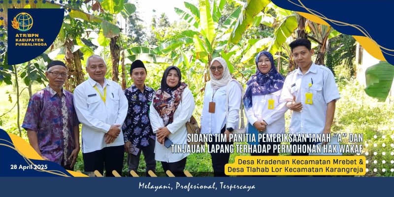 Tim Panitia Pemeriksaan Tanah “A” melaksanakan sidang dan tinjauan lapang terkait permohonan hak wakaf di dua lokasi berbeda dalam wilayah Kabupaten Purbalingga pada Rabu, 06/08/2020. Sidang dan tinjauan pertama berlangsung di Desa Kradenan, Kecamatan Mrebet, untuk melakukan pemeriksaan dan tinjauan terhadap permohonan hak wakaf oleh Yayasan Baitu Junnatin Al Rohman. Selanjutnya tim bergerak ke lokasi kedua di Desa Tlahab Lor, Kecamatan Karangreja, atas permohonan wakaf dari Perkumpulan Nahdlatul Ulama.