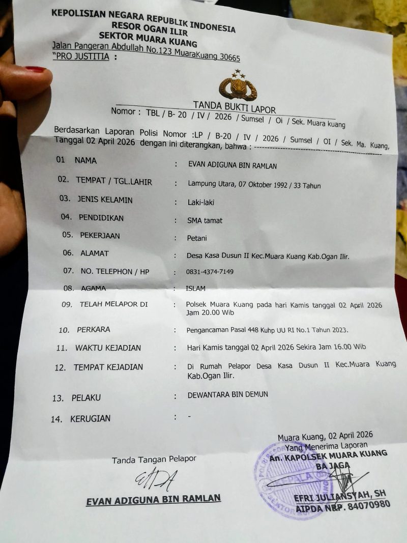 Tak terima dengan ancaman tersebut, korban langsung melapor ke Polsek Muara Kuang pada malam harinya. Laporan itu telah resmi tercatat dengan nomor TBL/B-20/IV/2026/Sumsel/OI/Sek. Muara Kuang.