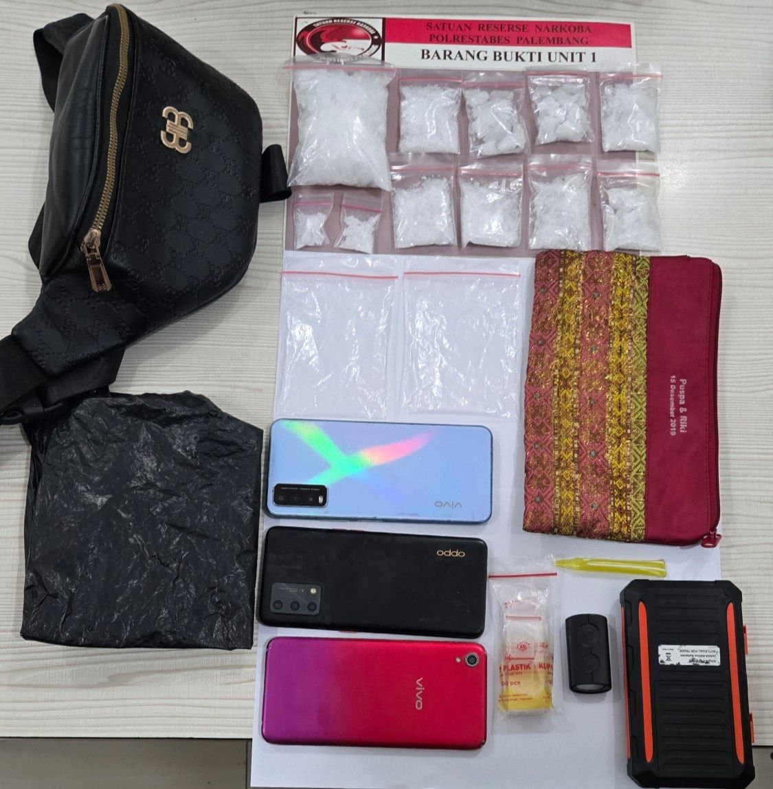Secara keseluruhan, barang bukti yang diamankan meliputi 11 paket sabu dengan berat bruto 189,55 gram, satu unit timbangan digital, plastik klip, alat bantu pengemasan, tiga unit telepon seluler, serta satu unit sepeda motor yang digunakan dalam aktivitas peredaran narkotika.