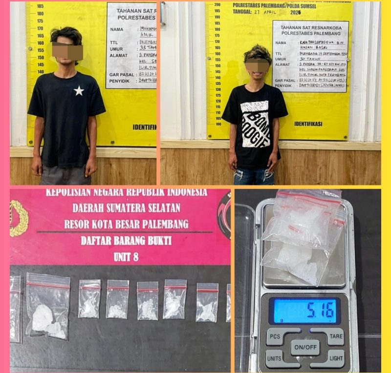 Polda Sumatera Selatan melalui jajaran Polrestabes Palembang kembali mengungkap kasus peredaran narkotika jenis sabu dengan membekuk dua tersangka yang beroperasi bersama dari sebuah kamar kost di Jalan Trikora, Lorong Harisan, Kelurahan Demang Lebar Daun, Kecamatan Ilir Barat I, Kota Palembang, pada Senin siang, 27 April 2026, sekira pukul 13.00 WIB.