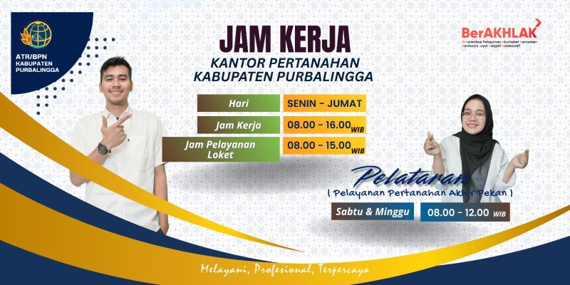 Untuk memberikan pelayanan terbaik bagi masyarakat, Kantor Pertanahan Kabupaten Purbalingga membuka layanan setiap hari kerja Senin sampai Jumat.