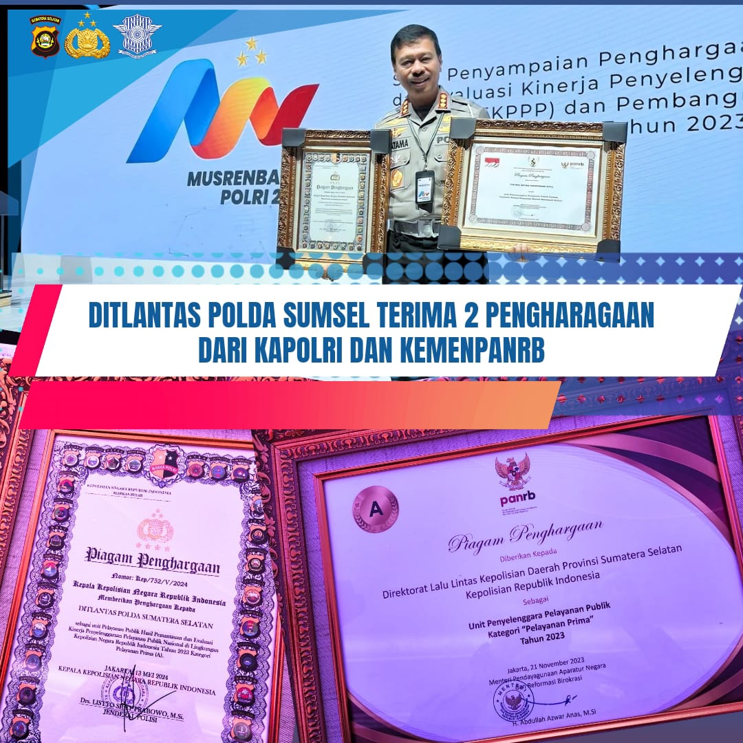 Palembang,-kompaslink.com| Ditlantas Polda Sumsel Menerima 2 Penghargaan dari Kapolri dan KemenpanRB,Saat dihubungi Dirlantas Polda Sumsel Kombes Pol M.Pratama Adhyasastra SH.SIK.MH mengatakan membenarkan Menerima penghargaan…